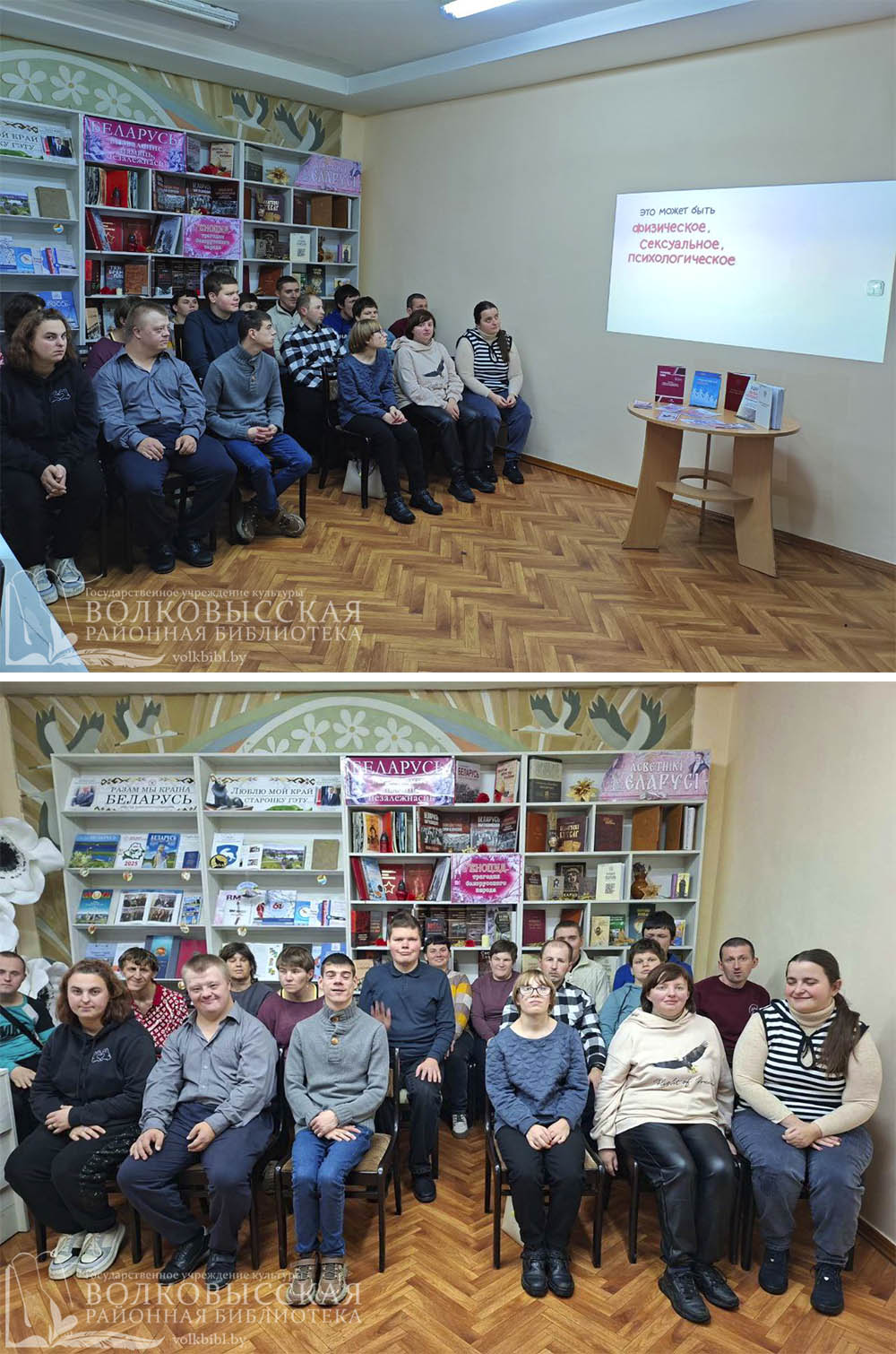 11 ноября, с целью предупреждения насилия и жестокого обращения, в районной библиотеке прошел час профилактики "Вместе против насилия". Подопечные ТЦСОН познакомились с понятием, формами и причинами насилия. Рассуждали о том, как необходимо вести себя в социальной среде, общаться культурно со сверстниками, взрослыми и пожилыми людьми, не нарушая норм поведения. Узнали, в каких документах говорится о защите прав человека от насилия. Мероприятие способствовало формированию у присутствующих жизненной позиции, основанной на уважении себя как личности и уважении окружающих людей. В конце разговора юноши и девушки ознакомились с памяткой, как защитить себя от насилия.
