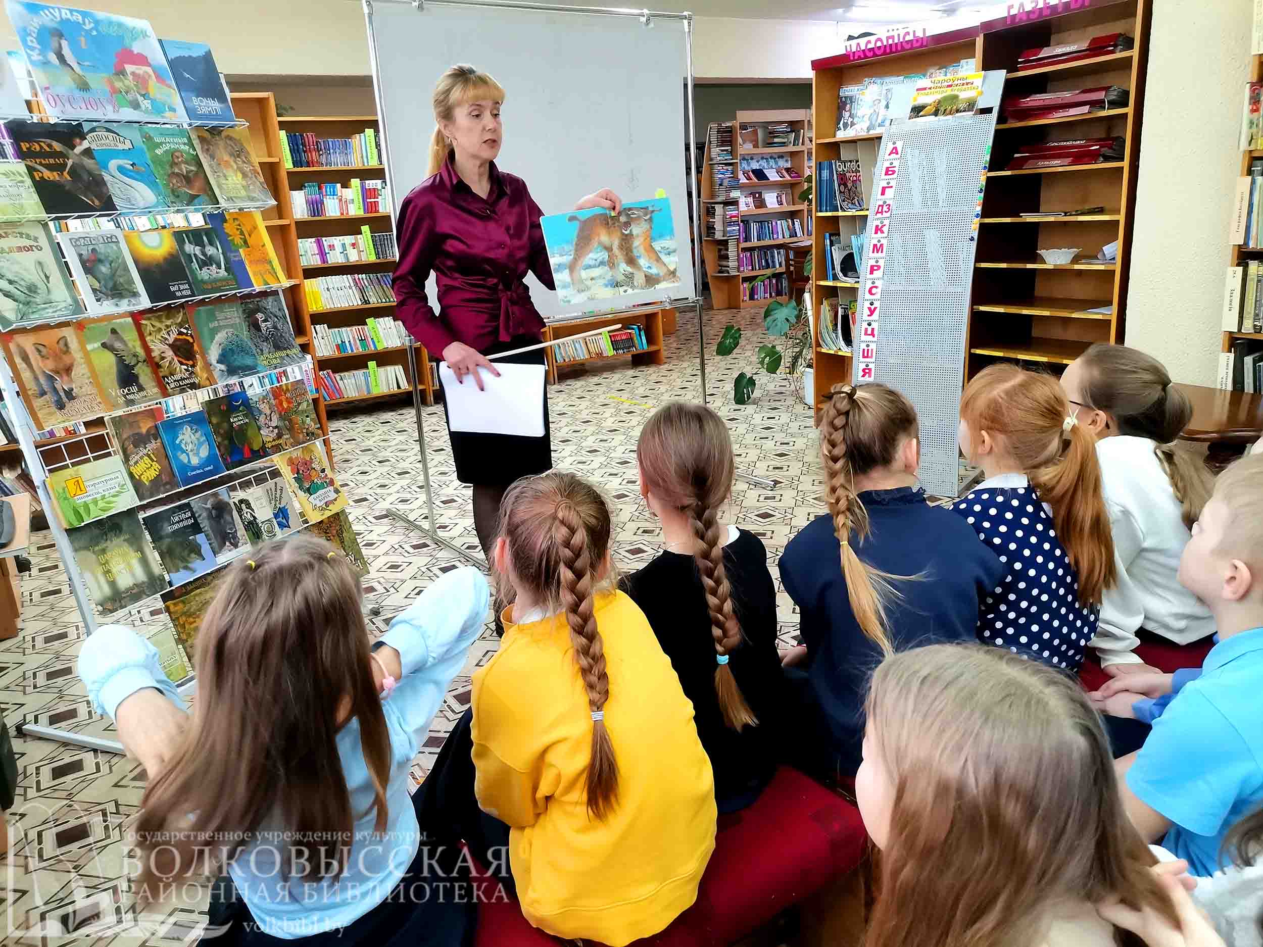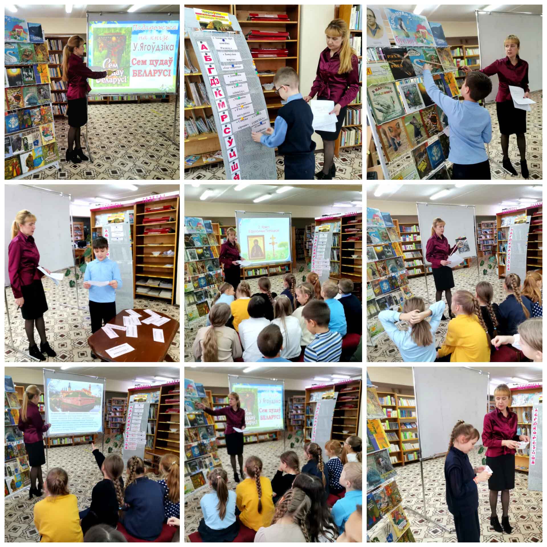 Бібліятэкар пазнаёміла вучняў з разнастайнай тэматыка-жанравай творчасцю пісьменніка. У майстра слова аднолькава выдатна атрымліваюцца апавяданні пра розных жывёл і птушак і апрацоўка легенд і паданняў пра іх; своеасаблівая інтэрпрэтацыя народных казак і ўласныя казкі; а таксама творы на гістарычную тэматыку. Свой расказ бібліятэкар дапоўніла паказам кніг з тэматычнай выставы і зачытваннем цікавых урыўкаў з выбраных твораў. Убачылі дзеці і змястоўную прэзентацыю, створаную па кнізе Уладзіміра Ягоўдзіка “Сем цудаў Беларусі”.