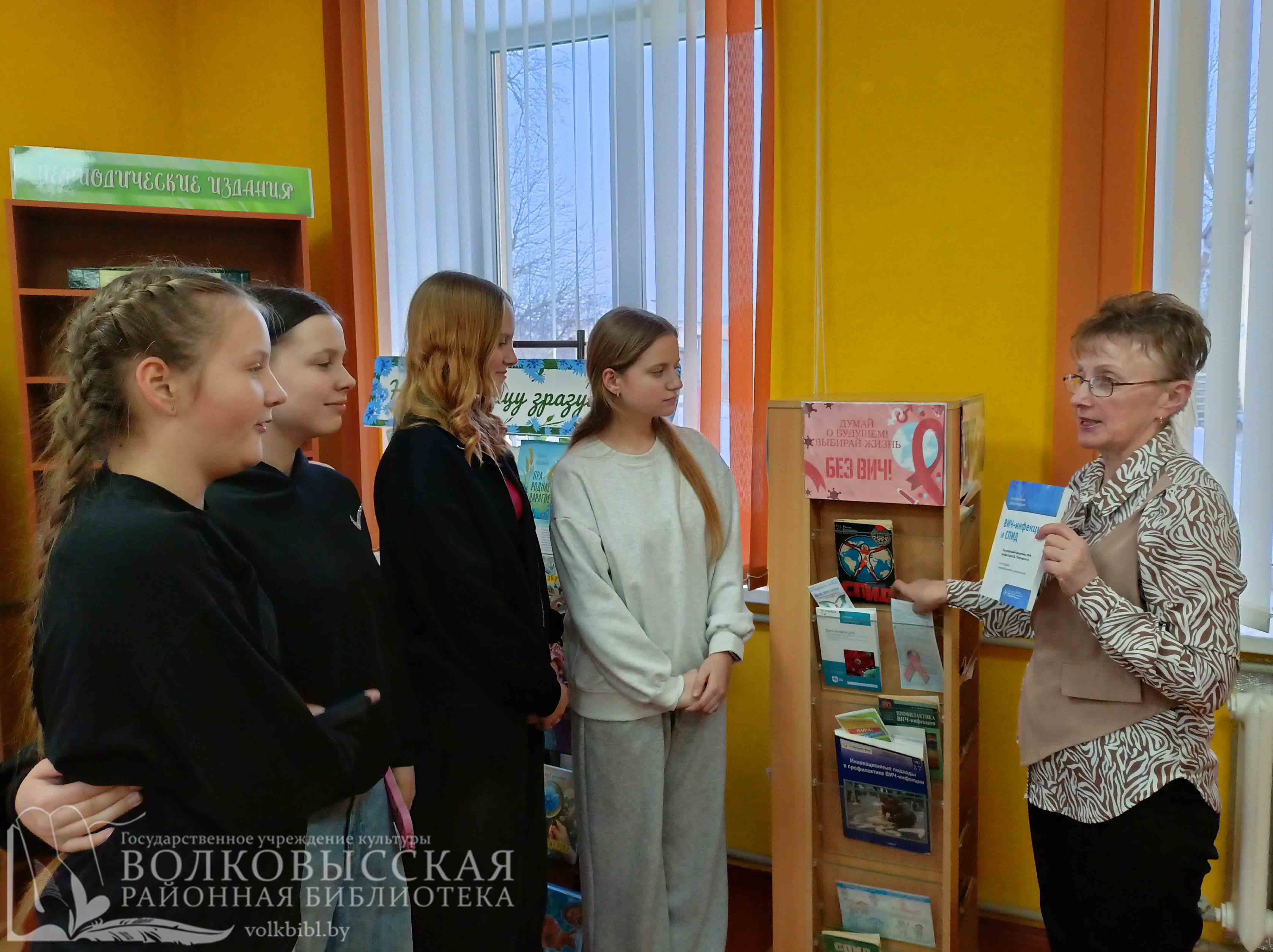 Библиотекарь рассказала, что такое ВИЧ и СПИД, обсудили пути передачи ВИЧ-инфекции, говорили об усилиях, которые прилагает международное сообщество, противодействуя распространению этого заболевания, постаралась донести до подростков мысль о том, что эта проблема касается сегодня каждого, так как вирус может попасть в организм любого человека.