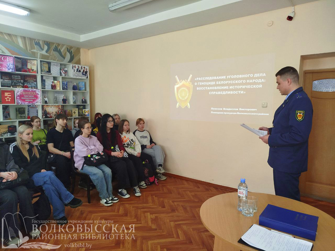12 марта в районной библиотеке состоялась встреча помощника прокурора Волковысского района Помозова Владислава Викторовича с учащимися 2 курса Волковысского колледжа УО «Гродненский государственный университет им. Я. Купалы».