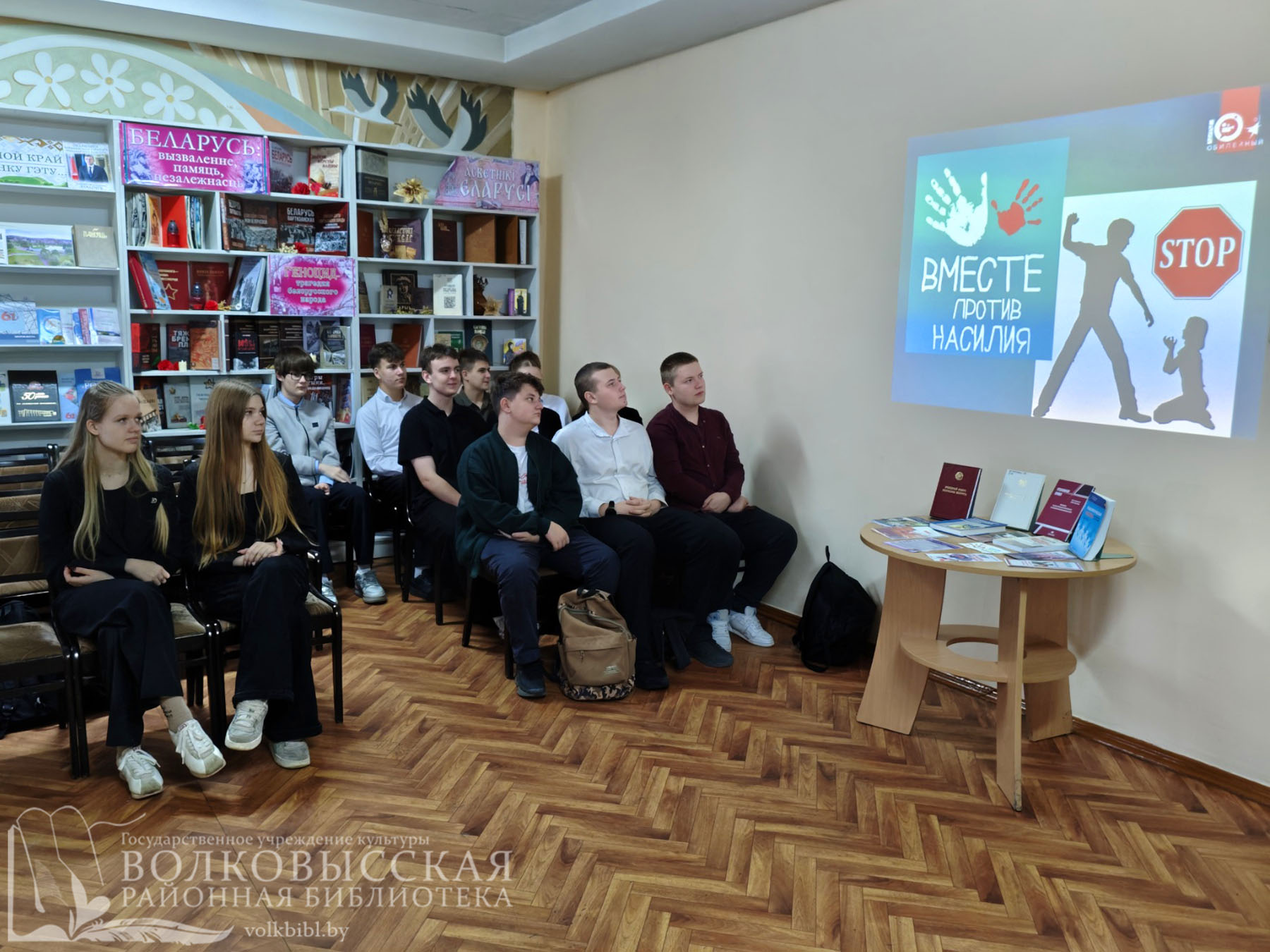 С целью профилактики насилия в отношении к несовершеннолетним 10 декабря в Волковысской районной библиотеке прошел информационный час с учениками 10 класса Гимназии №1 г.Волковыска на тему «Детский мир без жестокости и насилия». Встреча прошла в форме открытого диалога. В ходе мероприятия обсуждались вопросы профилактики домашнего насилия, противоправного поведения. До сведения учащихся была донесена информация о негативных последствиях бытовых конфликтов и необходимостью своевременного реагирования на них.