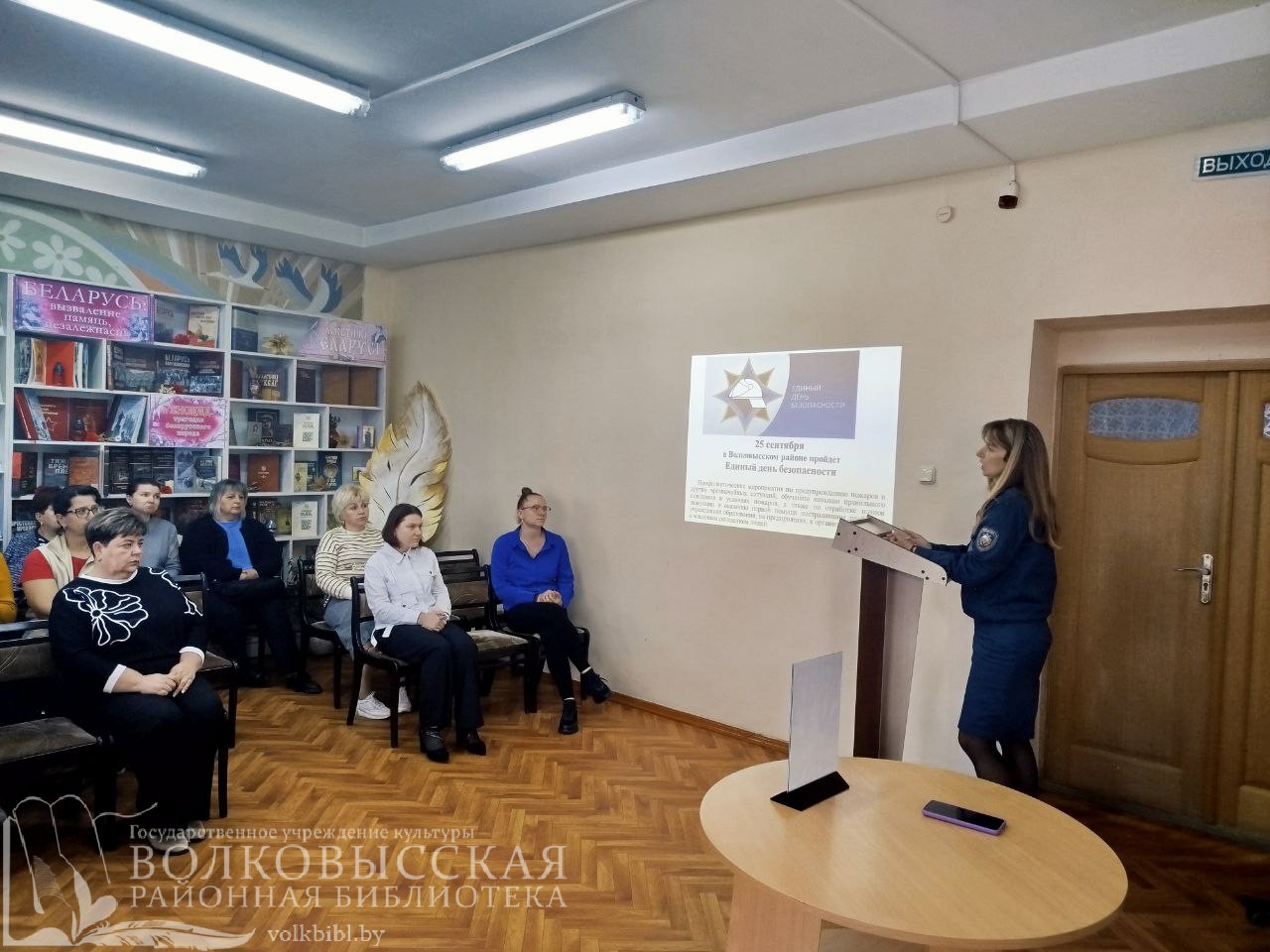 24 сентября в преддверии Республиканской акции «Единый день безопасности» в Волковысской районной библиотеке для библиотекарей прошел информационный час «Безопасность в нашей жизни».